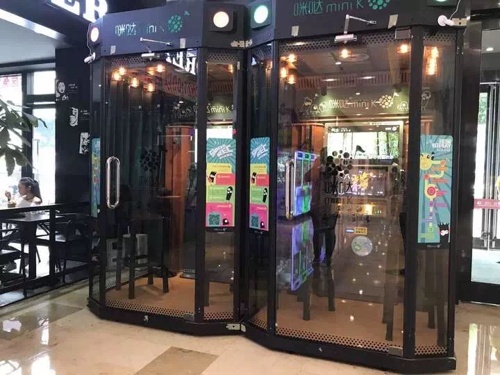 單個“迷你KTV”占地面積小,用玻璃門圍起,門內掛有各種圖案裝飾的布簾,給消費者營造出一種“封閉”的體驗。消費者可自助選擇曲目,付款后就可以戴上耳機,拿起話筒,一展歌喉,將“迷你KTV”變成個人秀場。