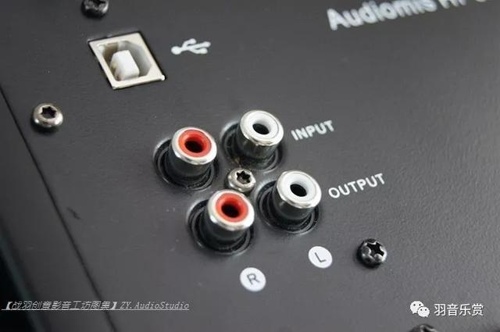 HP5背面遵循簡潔的原則集合了操控旋鈕和多種信號輸入接口,設計由上而下排布井然有序,操控功能一目了然。最上端由一枚電源開關帶音量調節的旋鈕坐鎮,下方為一個USB輸入端,方便玩家進行DSP控件的調節,緊挨著是并列的一組兩枚RCA模擬信號輸入端子和一組兩枚RCA模擬信號輸出端子,一組兩枚精工水晶純銅鍍金音箱輸出接線柱位于背面最下方,其左側便是DC電源接入端口。如此排布設計顯然融入了人機操作的考量,確保了音箱接線時不會互相干涉。此外,HP5音箱底部敷設一層PV墊,用于承載平穩減少箱體與接觸面的震動滑移,整體制作工藝精湛。