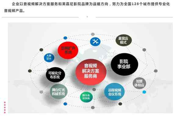 公司以自主研發、生產智能影院產品及音視頻系統集成服務為主導,2004年創立工程事業部,主要為用戶提供專業音響擴聲系統、舞臺機械舞臺燈光系統、數字會議系統、大屏顯示系統、智能化中央集成控制系統、遠程視頻會議系統、可視化分布系統,家庭影院系統等一系列音視頻集成解決方案。2009年創立英嘉尼影院事業部,英嘉尼以“大道至簡”的設計理念和“讓愛回家”的文化理念,從科技感的外觀設計,高品質的音效追求,一體化的功能,便捷的安裝,簡易的操作,滿足現代家庭娛樂生活的的高品質需求,匠心打造出了一系列優質家庭影院產品。
