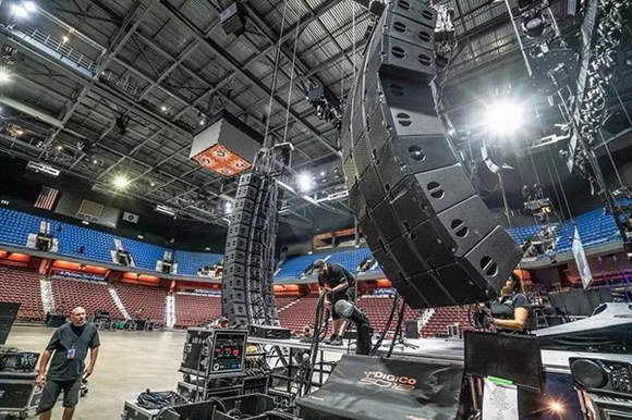 正在吊裝的 Adamson 線陣列揚(yáng)聲器