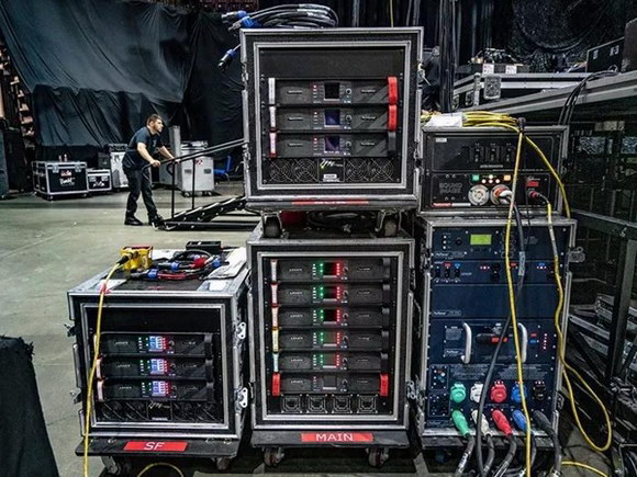 主線陣由12臺(tái)Lab Gruppen PLM 5K44功率放大器(“足以驅(qū)動(dòng)18只E15”,Chase補(bǔ)充說)驅(qū)動(dòng),2臺(tái)Lake LM 44處理器進(jìn)行預(yù)設(shè)。另有2只機(jī)架每只包含4臺(tái)PLM 5K44功率放大器為側(cè)場(chǎng)和前場(chǎng)補(bǔ)聲揚(yáng)聲器供電。