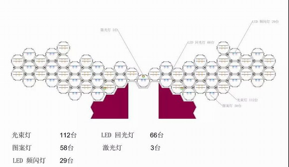 整個舞臺跨度非常大,燈光需要在前期就與導演組溝通確定藝人表演的位置,來進行分區域編程,否則如果藝人在主舞臺表演,而大量的cue卻在地屏舞臺時,會導致燈光在鏡頭前穿光,拍攝人物時候會造成不清晰的畫面。