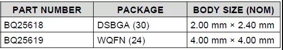 其中BQ25618跟BQ25619在規(guī)格上一致,區(qū)別在于BQ25618采用的是小型化的DSBGA封裝,0.4mm的管腳間距,對(duì)生產(chǎn)工藝有較高的要求,而B(niǎo)Q25619采用的稍大一點(diǎn)的WQFN封裝,方便線路布板,器件的封裝尺寸見(jiàn)下圖一。