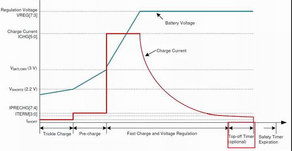 2. 為了補(bǔ)償截止電流的精度,讓電池能夠充的更滿一些,BQ25618/9增加了TOP-OFF Timer功能,如下圖四紅色框所示,在系統(tǒng)偵測(cè)到充電截止后,還可以選擇性的通過(guò)IIC增加充電時(shí)間(0,15min,30min,45min)。