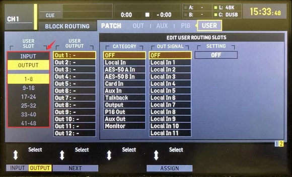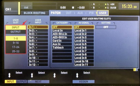 然后看圖二,切換到IN PUT 的頁面,在1-8處選擇User In 1-8即可。注意一點的是,當你只是修改了圖一的IN2,圖一的USER INPUT的IN1、IN3-8必須按照以上操作,一一分配好它的路由,指定好它的輸入源,不然,你的CH1、CH3-8是沒有信號源存在的。
