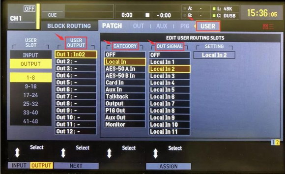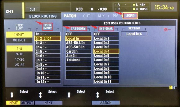 假設現在要將臺子的CH2指定使用本地物理輸入接口4,需要如圖一中設置。選擇USER INPUT 的IN2 ,CATEGORY處選擇Local In ,然后在IN SIGNAL處選擇Local In 4。