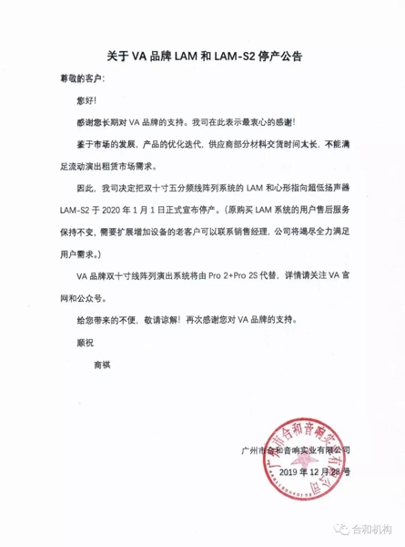 關(guān)于VA品牌LAM和LAM-S2停產(chǎn)公告