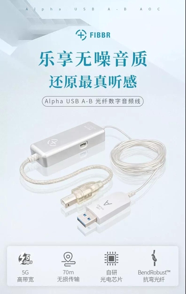 作為HiFi發燒友一年一度的非凡盛宴,2019廣州國際音響唱片展于12月6日至8日在廣州東方賓館、中國大酒店舉行。在各種極品發燒音響器材中,來自FIBBR菲伯爾的 Alpha USB 光纖數字音頻線顯得別具一格:純光纖隔絕電噪聲干擾,呈現真正純凈的音質,帶給發燒友高端的悅聽體驗。