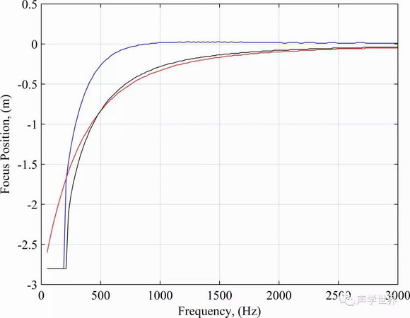 揚(yáng)聲器陣列進(jìn)行聚焦的焦位置,在實(shí)際產(chǎn)品中,不是簡單地由基于幾何射線的模型定義的,而是受衍射影響。因此焦點(diǎn)位置是聲源大小和頻率的函數(shù)。