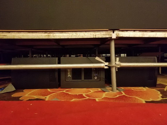 舞臺(tái)側(cè)返同樣使用M-F3A PRO,由于返送音箱的背后就是燈光的Layer架,需要避開(kāi)電腦燈的投射范圍,故使用常規(guī)的音箱三角架搭配U型托盤(pán)將M-F3A PRO架高,縮小占地面積,不遮擋燈光部門(mén)的工作同時(shí)滿(mǎn)足了舞臺(tái)的覆蓋。