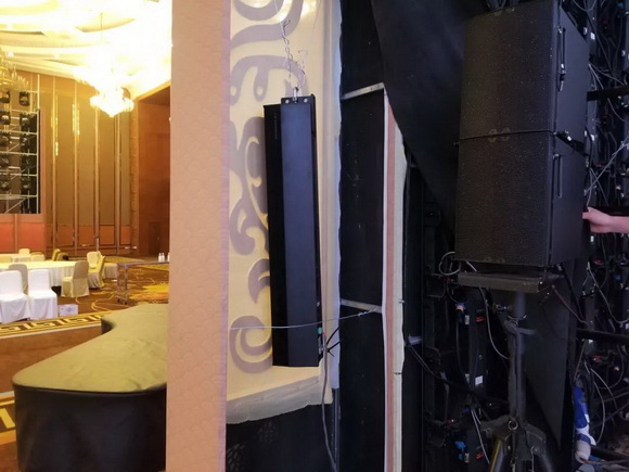 舞美設(shè)計(jì)圖中留給音箱吊掛的位置,只有第一排的LED屏幕兩側(cè)的裝飾柱后方,考慮到承重問(wèn)題,主擴(kuò)M-F3A PRO線(xiàn)陣只能吊掛在最外側(cè)的裝飾柱背后,借助燈光的layer架找吊掛點(diǎn),主擴(kuò)線(xiàn)陣列距離側(cè)墻僅2米左右。