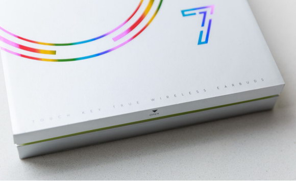 ▼與很多“簡包”真無線比起來,魔浪o7的盒子設計要大很多,極具設計感的白色+彩色反光油墨印刷,讓其頗有高品質伴手禮的時尚感。