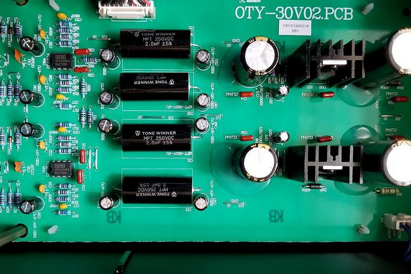 在TY-30右側的模擬音頻放大板上,我們可以明顯看到4顆碩大的黑色MPT電容,位于左/右聲道音頻通道的關鍵位置,起做隔直和耦合音頻的作用。喜歡動手摩機的發燒友都明白,聚丙烯電容是校聲的秘密武器,一只發燒級的進口聚丙烯電容往往都擁有不菲的身價。