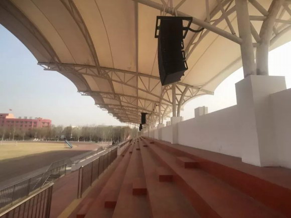 戶外體育場主擴聲由12只Digiresearch(DR)VT10雙十寸線陣列音箱搭配4只VT18B超低頻音箱打造。分別以3+1為一組,共四組吊掛在觀眾席的正上方指向場外。整個擴聲系統(tǒng)由5臺MX1000,3臺MX700功率放大器作驅動,1臺DM20數(shù)字調音臺,1臺DP36MARK IV數(shù)字音響處理器,2臺SP8電源時序器組成。