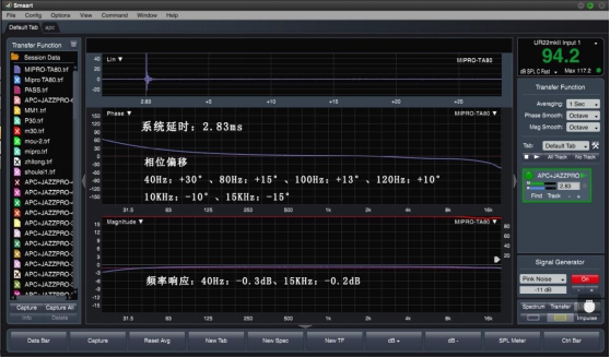 在 Smaart 窗口顯示下,從圖一顯示參數讀出:信號經過無線發射、無線接 收返回到聲卡的系統延時為:2.83ms(之前測的另一套是 2.88ms),特意上 Mipro 官網 www.mipro.cn 查看了一下,官方數據顯示系統延時為 2.7ms,誤差 0.13ms, 官方測試肯定是在 AP 平臺上測試的結果,Smaart 畢竟不能當產品檢測工具(也 可能這屬于廠商限定的誤差范圍內吧)?