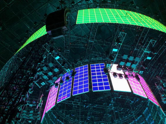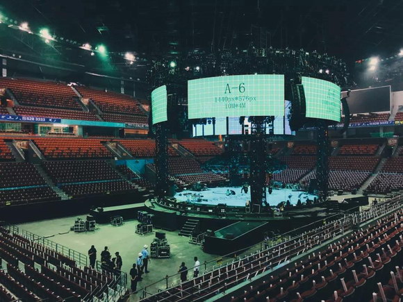 “就這樣”演唱會深圳站的舞臺是四面環繞式舞臺,舞臺上方安裝了環繞LED屏幕。四面環繞式舞臺不但能拓寬了觀眾視野,也有利于對揚聲器的安裝吊掛。
