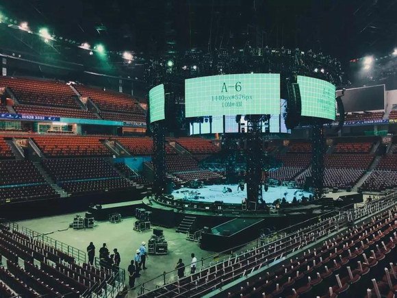 “就這樣”演唱會深圳站的舞臺是四面環(huán)繞式舞臺,舞臺上方安裝了環(huán)繞LED屏幕。四面環(huán)繞式舞臺不但能拓寬了觀眾視野,也有利于對揚聲器的安裝吊掛。