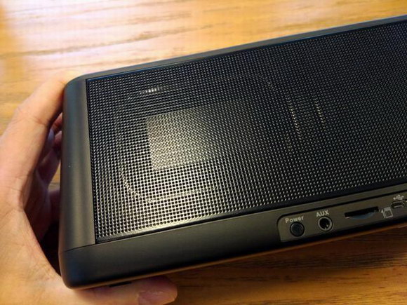 在南卡B1藍牙音箱無源無源低頻輻射器下方正中間的位置,就是藍牙音箱的輸入與開關部分。從左到右分別是:電源鍵、AUX的3.5mm接口、最大支持32GB的Mirco SD卡插槽、Mirco USB接口的充電口。