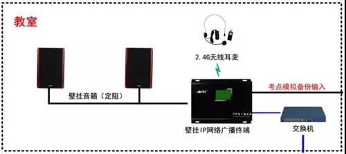 教室IP網絡廣播終端內置模擬備份模塊和2.4G無線耳麥模塊,當教室IP網絡終端遇到斷網、斷電或者在整個服務器癱瘓、網絡延時等情況下,都可以通過機房的IP廣播保障主機自動切換到模擬備份模塊。而老師則可以通過2.4G無線耳麥對教室進行無線擴聲,本地教學等。