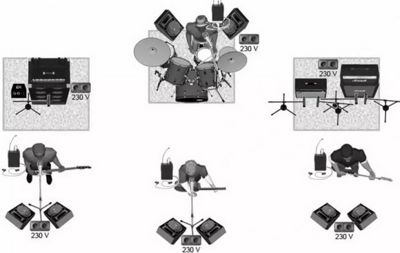 要讓樂手順利的演出,個性化的監(jiān)聽系統(tǒng)是標配,調(diào)音師要記錄每個樂手對耳返中各樂器平衡的要求,有的人喜歡自己樂器的聲音大一些,有些人則只想聽鼓的聲音,這都是個人習慣,調(diào)音師則需要完全配合。而地板返聽音箱也會有特別的設(shè)計。總之每個人的監(jiān)聽系統(tǒng)都是獨一無二的,也是最令他舒適的。