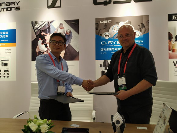 8、東方佳聯本次主打解決方案及亮點產品等分為五大部分,包括綜合會議系統解決方案采用QSC Core數字音頻處理器作為核心管理系統, QSC CX-Q網絡數字功放、QSC AD-S系列壁掛揚聲器以及森海塞爾TeamConnect Ceiling 2天花式吊頂陣列麥克風、Visionary Solutions分布式網絡視頻設備、Kramer無線協助系統構建一整套多功能綜合會議解決方案。通過產品及系統搭配,可以讓客戶更加簡易的操作項目,實現高效運營。