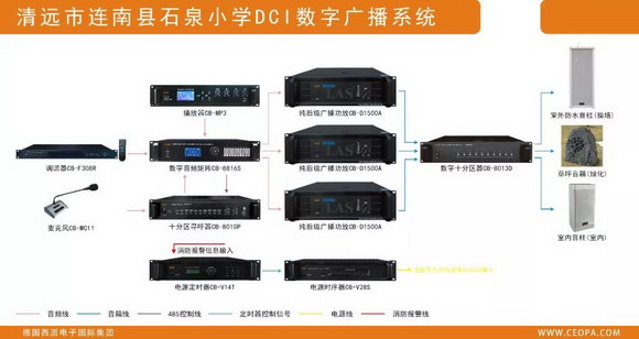 西派CEOPADCI數字廣播系統主要用于廣東清遠市連南縣石泉學校,實現如播放背景音樂、廣播通知以及廣播尋呼等功能。廣播覆蓋全部區域。主要用于校園公共場合,實現如定時打鈴、舉行全校的活動、通知、升國旗、課間操、播送課間音樂、表揚先進、召開全校大會等功能。