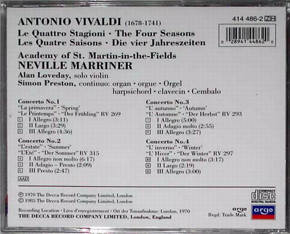為此我選播了幾張音質一流的小提琴小品。其中這張是我珍藏多年、現在已經諜海難尋、最能代表小提琴音質的細膩油潤、華麗鮮活的小提琴協奏曲天碟:這就是由當年赫赫有名的新西蘭小提琴演奏家阿倫.洛夫德演奏、馬里納爵士指揮英國圣馬丁學院樂團演奏的維瓦爾第《四季》,編號:ARGO 414 486-2。