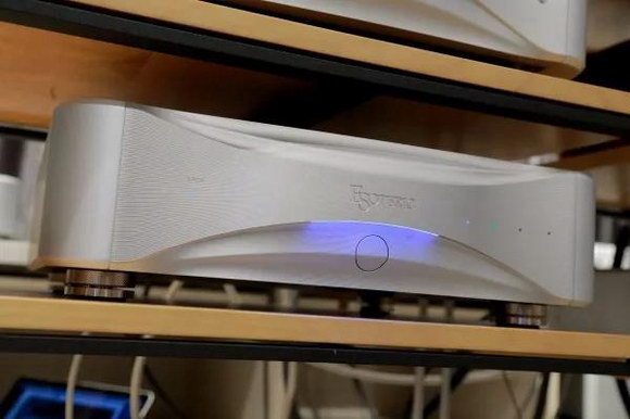 這次代理搭配演出的器材也是精銳盡出。擴大機是darTZeel NHB-18NS前級與NHB-108后級。看到代理商搭上這組前后級,叫我興奮不已。前不久,我才寫了darTZeel CTH-8550綜合擴大機的評論,這臺綜合擴大機,其聲音之好,讓我難以忘懷。這次,再有機會聽到darTZeel的前后級,而且各自有其高明設計,又與CTH-8550不同,當然難捺躍然心情。NHB-18NS的機箱與CTH-8550很像,但是前面板設計不同,訊源選擇采用旋鈕切換,音量旋鈕轉起來則一樣彈手。我聽到的這臺是最新版本的,因此面板右上方多加了一個液晶熒幕,可以顯示當前工作訊息。NHB-18NS配有一個外接電源,但它不是僅是電源分離那樣簡單。NHB-18NS是采用電池供電,機內有電池蓄電,機器連接著外部電源供應器。平常在聽的時候,電力都是由內建電池供應,這時,就算不接外部電源也可以聽;當您不聽的時候,電池就開始充電。這樣可以提供理論上最干凈的直流電,徹底隔離掉電源噪聲。