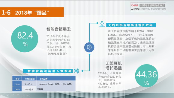 中國電子音響行業協會副秘書長張昌海受中國電子音響行業協會黃桅秘書長的委托作了《2019中國音響行業發展情況及市場觀察》的報告。報告通報了我國主要電子音響產品今年上半年的產值、出口等數據,分析了產品結構,對重點產品分析了發展特點和趨勢,對耳機和智能音箱增長較快的產品作了重點分析,指出了2018行業的發展特點。