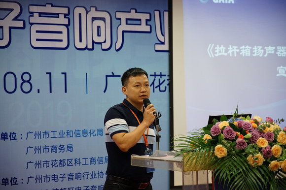 廣州市電子音響行業協會《拉桿箱揚聲器系統》團體標準制定組組長、廣州番禺巨大汽車音響設備有限公司品質部總監、企業首席質量官(CQO)黃開軍在論壇上對協會《拉桿箱揚聲器系統》團體標準的具體條款進行了解讀和宣貫。