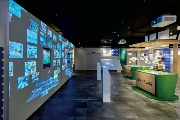 ▲在介紹“晴海FLAG”實現的東京新生活展區,采用許多本公司生產的投影機、顯示器,展示新交通工具、公用空間、設施、庭院空間的景點等。