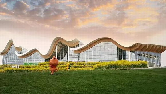 主體建筑透明的玻璃,映照著藍天、白云、黃花、綠草等自然景象;玻璃之上,藍天為底,畫上了黃白相間的波浪線條,像極了隨風起舞的稻浪。