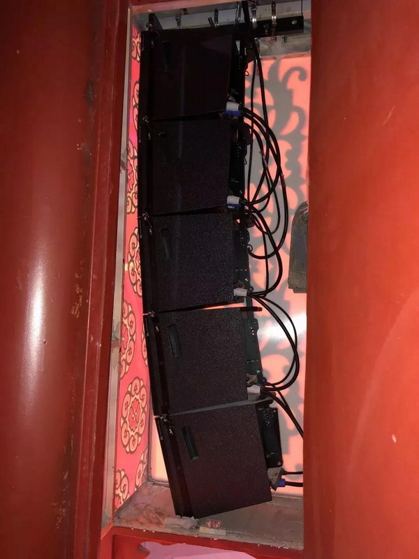 因為舞美設計方面的布景非常精致美觀,沉浸式的音箱布置方式會帶來很多裸露的音箱設備,如果處理不好就會影響整個布景效果,甚至會給觀眾帶來突兀的視覺感受。因此在音箱的選擇上,一方面要達到音效的效果要求,另一方面又需要隱藏安裝。