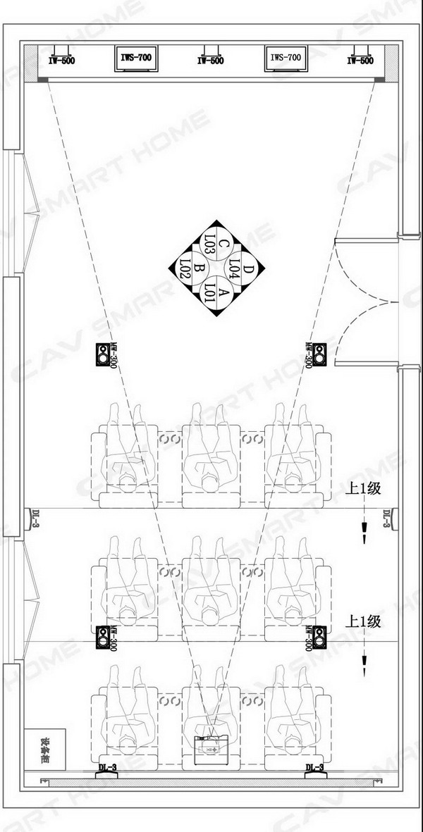 在影音器材方面,根據客戶的預算和想要實現的效果,我們為他推薦了CAV與德國伊頓合作研發的IW-500作為主/中置音箱,丹麥Scan-Speak(紳士寶)定制版DL-3作為環繞音箱,美國代頓定制版IWS-700超重低音,再加上德國ETON(伊頓)定制版MW-300作為置頂音箱,組成7.2.4杜比全景聲影院系統,360度全方位的聲場環繞,讓影音室每一個角落都能感受到震撼聲效。
