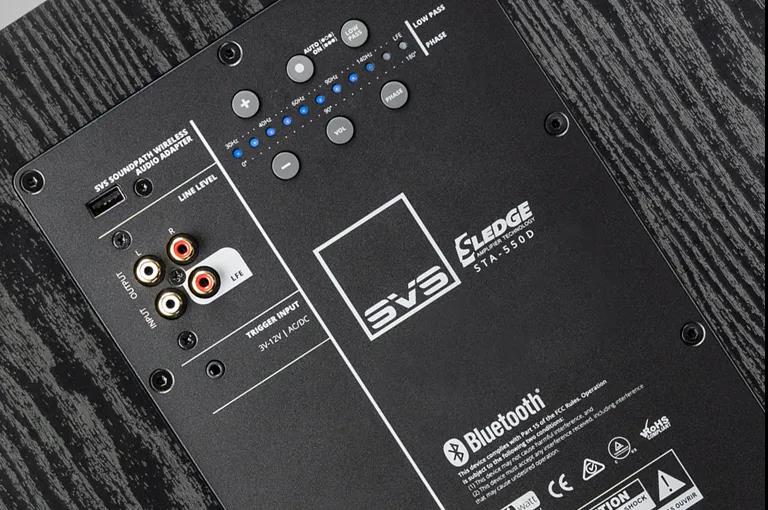 在這些按鈕和led的左邊是一對單端左/右輸入和輸出插孔(RCA);右通道輸入也被標記為LFE,表示低頻通道。還有一個USB Type-A端口用于可選的SVS SoundPath無線音頻適配器。最后,有一個12V觸發器輸入,主電源開關,和一個IEC兼容的120V(國內版為220V)交流連接器供可拆式電源線使用。