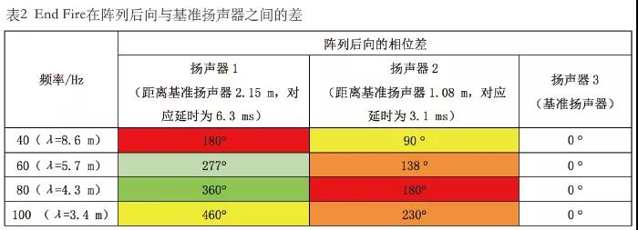 以3只揚聲器組成的End Fire陣列為例,見圖3,在陣列前向(觀眾區),3只揚聲器聲壓級會增加約9 dB;而在陣列后向(舞臺方向),揚聲器可用頻帶內相位關系大多位于120~240°之間,總體能量是相對抵消的。具體分析其中心頻率80 Hz左右的相位情況,以離舞臺最近的揚聲器為基準,第2只揚聲器加入延時處理之后與第3只揚聲器所輻射聲波的相位差為180°,第1只揚聲器與第2只揚聲器所輻射聲波的相位差同為180°,因此揚聲器1與揚聲器2、揚聲器2與揚聲器3在中心頻率的相位是互相抵消的。3只揚聲器的40 Hz、60 Hz、80Hz和100 Hz共4個具有代表性的頻率,在陣列前向和后向與基準揚聲器之間的相位差見表1、表2,并參照圖1,通過顏色可直觀地觀察出疊加情況。