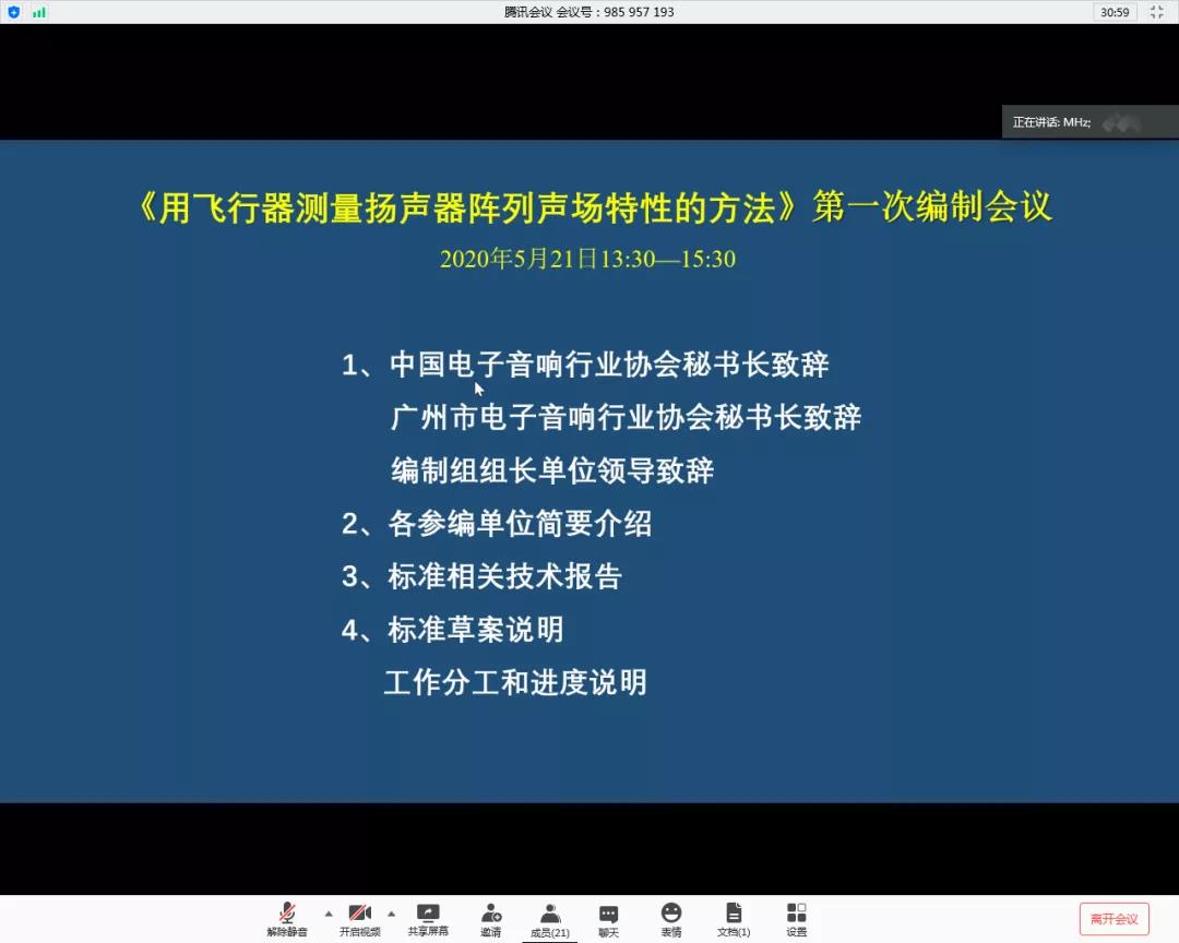 【又訊】 2020年5月21日下午,由廣州飛達(dá)音響股份有限公司和中國傳媒大學(xué)牽頭,中國電子音響行業(yè)協(xié)會和廣州市電子音響行業(yè)協(xié)會共同推動制定的《用飛行器測量揚聲器陣列聲場特性的方法》團(tuán)體標(biāo)準(zhǔn)編制組首次會議順利召開。