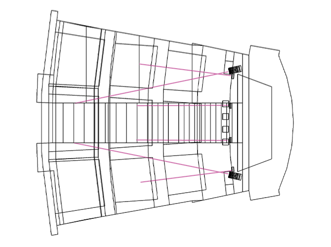 兩個鏡像的IV6垂直線陣列(從上到下遞增曲率)覆蓋整個空間,利用EASE®Focus 3中無源聲學優化工具的漸進式衰減設置,在整個空間內提供均勻的SPL。