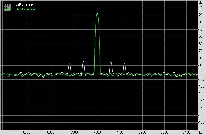 對(duì)于互調(diào)失真測(cè)試,我們可以發(fā)現(xiàn),串聯(lián)DM1的左通道(白色線)與直通的右通道(綠色線)的頻譜大部分一致。在60Hz后出現(xiàn)了120Hz及180Hz的諧波失真,這與上面的諧波失真測(cè)試相吻合。在放大7kHz附近的頻譜后出現(xiàn)了4個(gè)互調(diào)失真頻率,為7.06kHz、7.12kHz、6.92kHz及6.88kHz。這些均與60Hz有關(guān),但是互調(diào)失真的次數(shù)仍然控制的很好。因此總體來看DM1的互調(diào)失真是非常小的。