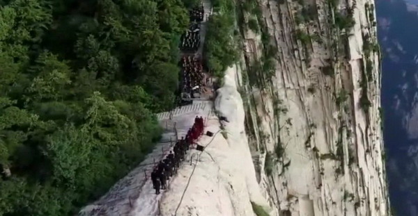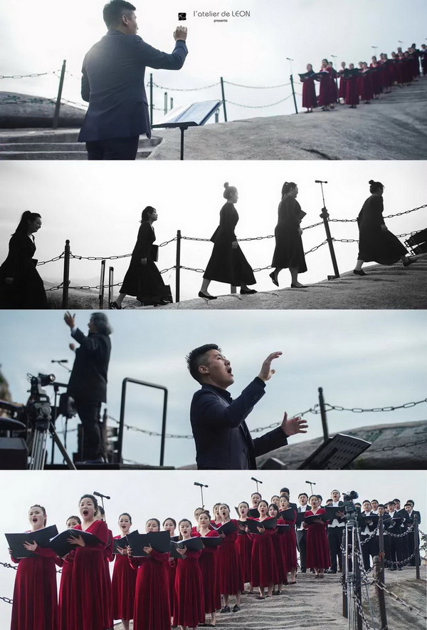 本次音樂會現場是在華山的標志性景點西峰頂上,由于地理位置的限制,整個交響樂編制、合唱團呈非常規的一字排擺位,而且指揮家身后的合唱團,也延伸出了好幾十米。