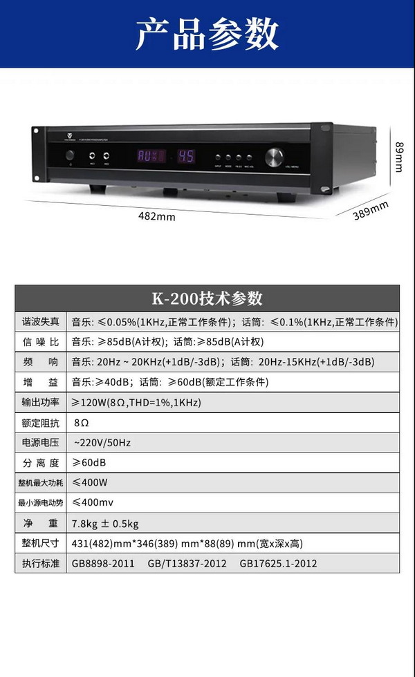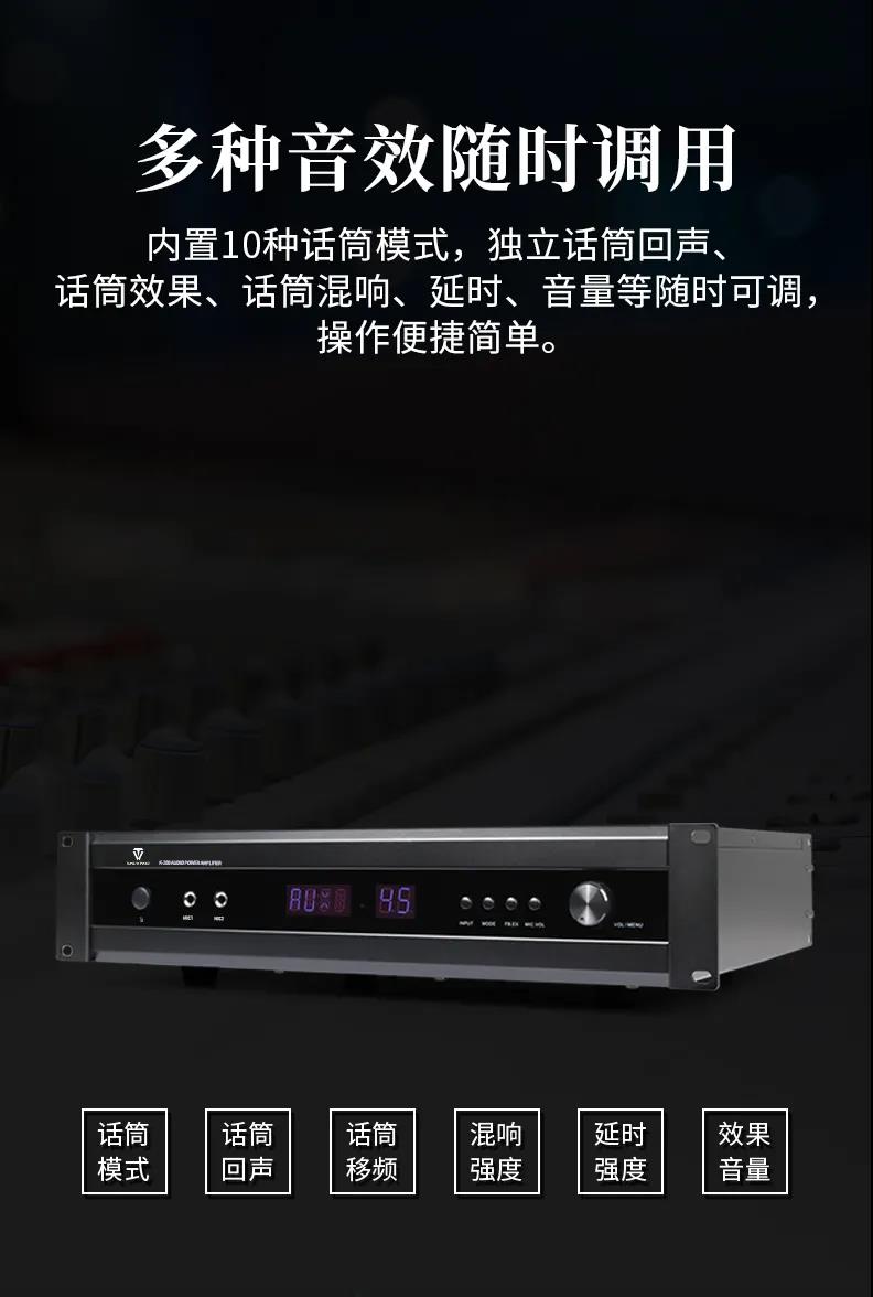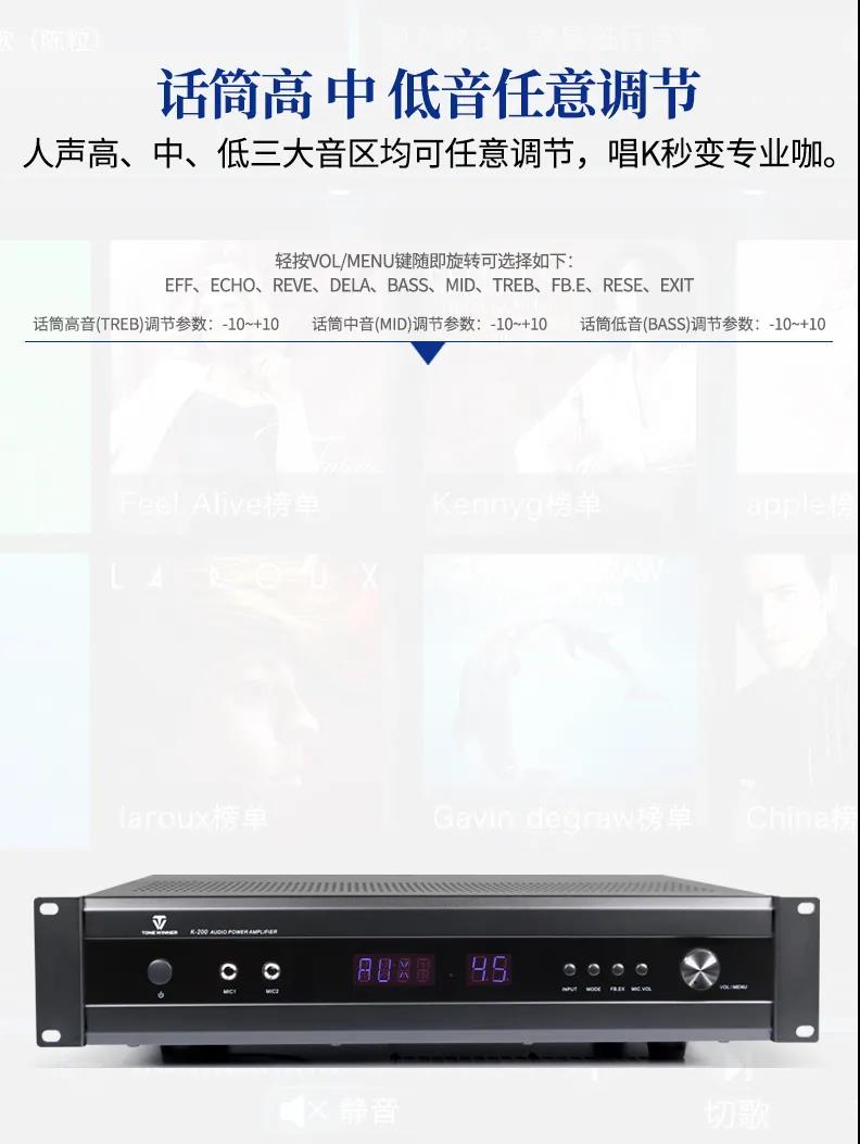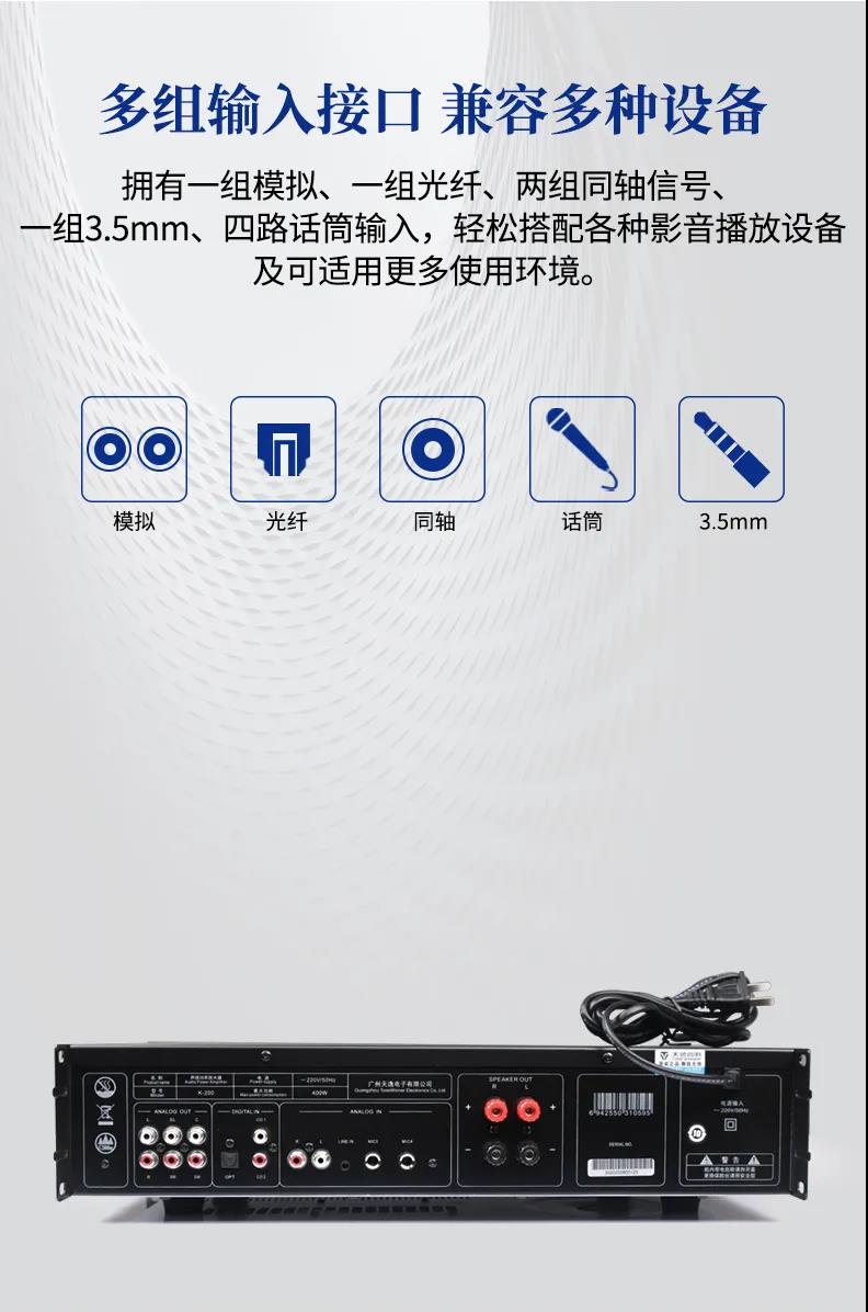 天逸K-200多功能DSP數字卡拉OK功放,采用先進的無失真動態壓縮限幅、成熟而完善的電子保護線路;以及防自激及削波保護、低失真高速Hi-Fi型的放大線路保證音頻信號平滑流暢、原汁原味的流露。同時支持5.1信號輸出,擁有光纖、同軸、立體聲等多種信號輸入口。內置的多種音效可輕輕松松讓您享受專業演唱會的效果。是一款應市場需求而特別設計的高性能、多用途、操作簡單的專業級DSP數字混響卡拉OK功率放大器。