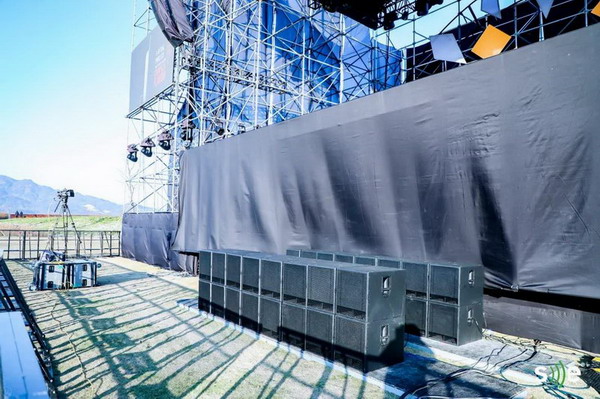 本次音樂節中,SE系統保障的科羅娜云舞臺,在跨年前的兩個周末都有晚風市集預熱演出,這就要求音響系統必須在12月18日進場搭建并調試完成交臺。進場當日,天公不作美,氣溫驟降,雨水不斷,無形中增加了施工壓力。好在提前準備了配套的線陣列防雨布,保證系統正常運行,且琴鼓傳聲團隊的成員專業高效的工作素養保證了整體進度。