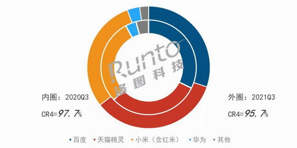 從品牌看,根據(jù)洛圖科技(RUNTO)數(shù)據(jù)顯示,2021年三季度,百度、天貓精靈、小米、華為位列前四,合計(jì)份額達(dá)到95.7%,中國智能音箱市場維持著較高的集中度。除此之外,喜馬拉雅憑借優(yōu)質(zhì)內(nèi)容和完善的產(chǎn)品布局占據(jù)一席之地,蘋果通過價格更低的入門款HomePod mini搶占中高端市場份額, TOP4品牌份額較去年三季度下降1.9個百分點(diǎn)。