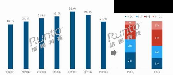 根據(jù)洛圖科技(RUNTO)線上數(shù)據(jù)顯示,2020年第三季度,屏幕音箱市場份額為21.4%,較去年同期下降1.4個百分點(diǎn)。隨著大屏產(chǎn)品的不斷增多,8寸產(chǎn)品在屏幕音箱市場中的份額達(dá)到34.4%,較去年同期增長3.7個百分點(diǎn);10寸及以上產(chǎn)品份額達(dá)到17.4%,較去年同期增長10.7個百分點(diǎn)。