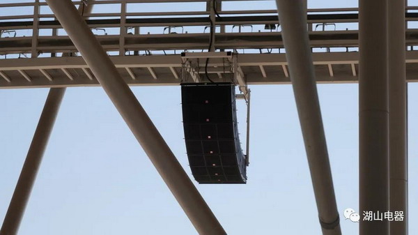 湖山郭清學(xué)高級(jí)工程師團(tuán)隊(duì)在設(shè)計(jì)規(guī)劃和選用設(shè)備時(shí)結(jié)合當(dāng)?shù)氐牡乩憝h(huán)境,與設(shè)計(jì)院充分溝通,因地制宜謀方法。不僅考慮了電子設(shè)備的耐用度和音箱外殼的耐腐蝕度,更重點(diǎn)考慮了擴(kuò)聲系統(tǒng)安裝過(guò)程和長(zhǎng)期使用中的安全問(wèn)題。他們因地制宜,采用高強(qiáng)度結(jié)構(gòu)鋼,吊管裝置和部件全都經(jīng)過(guò)防腐處理,且經(jīng)過(guò)質(zhì)檢站的各種實(shí)驗(yàn),材料堅(jiān)實(shí),數(shù)據(jù)準(zhǔn)確,他們還為吊裝裝置加裝了三重防護(hù),解決了在室外擴(kuò)聲系統(tǒng)在長(zhǎng)期使用中因受風(fēng)沙和氣候影響而產(chǎn)生的安全問(wèn)題。