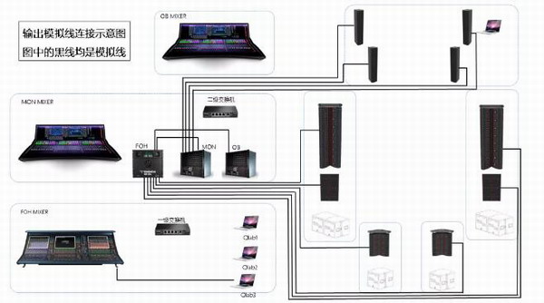 本次演出在傳統擴聲系統配置的基礎上有所擴展,并與國際標準接軌,單獨配備PA系統、Monitor系統、OB系統,三套系統各司其職,為不同需求的受眾服務: