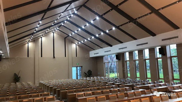 系統配置了經典穩定的無線話筒會議系統,并且根據會場的使用面積及使用情況,合理的將音箱掛在四周墻壁保證會場效果,確保整個會場的聲壓級和語言清晰度。音頻的處理部分,配備了行業內先進的數字音頻處理器,采用數模結合的處理方式,再功放進行信號的放大,最后由揚聲器進行輸出。