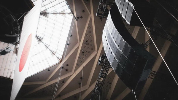 在本次演出中,整個場館部署了108只Adamson E系列和S系列揚聲器,聲場覆蓋呈270°分布。川上將32只E15作為主PA,搭配12只E119超低頻揚聲器吊掛安裝,12只E15作為側場補聲;16只E12幫助完成了270°的覆蓋角度;12只地面堆疊的E219超低頻揚聲器,補充更多低頻下潛。兩組4只S10+S119地面安裝在兩側作為舞臺補聲,以及用于后場延時的每側3只S10。S10和S10p則作為臺唇補聲。該系統由Adamson在日本的第一個也是最大的合作伙伴Sunphonix以及Blue Project提供。