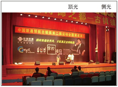 按照JGJ/57—2000《劇場建筑設計規范》要求,舞臺區應設置面光、耳光(圖14)、頂光、側光(圖15)等。在燈具的配置方面突出會議的特點,同時又具備文藝演出的功能,如受資金的制約,最低限度的要求也必須設置面光和頂光。會議和演出舞臺特別強調面光的設置,自舞臺正前方的面光吊桿(或面光橋)以45°~50°投向舞臺。滿足各類會議、文藝演出以及拍攝電視和實況轉播要求的照明指標:參考廣電部GY 5045—2006〈電視演播室燈光系統設計規范〉,照度不低于2 000 lx,色溫3 050 k±150 k,顯色指數不小于85。隨著攝影設備的指標提高,照度標準可適當降低到1 500 lx。另外,如按高清電視的拍攝標準要求,顯色指數則提高到90。