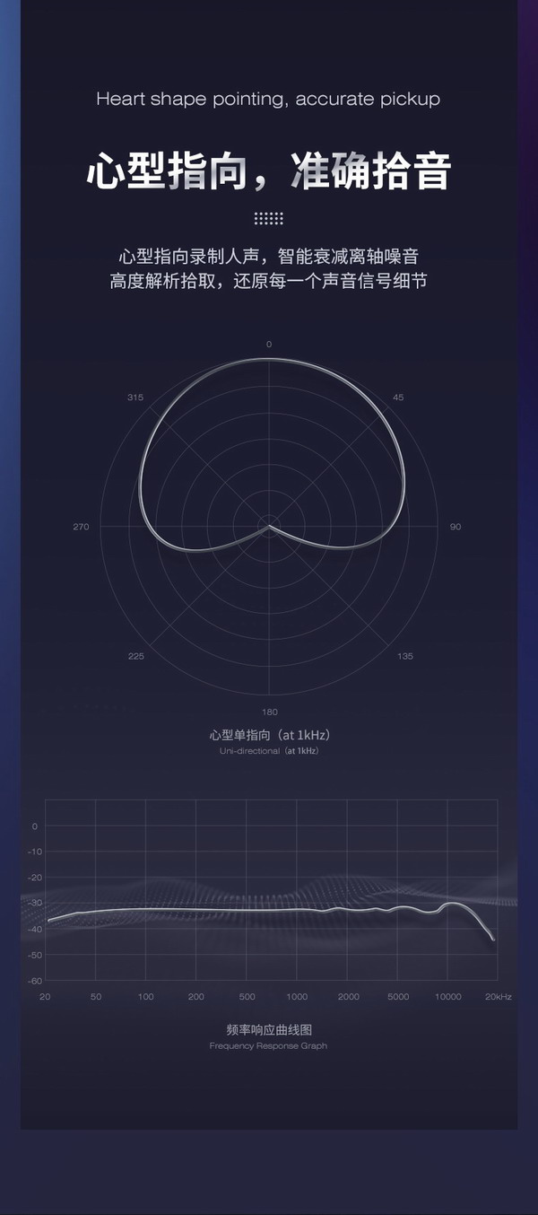 心型指向單向錄制人聲,防止過載失真的同時智能衰減離軸噪音,高度解析有效拾取,出色還原每一個聲音信號。